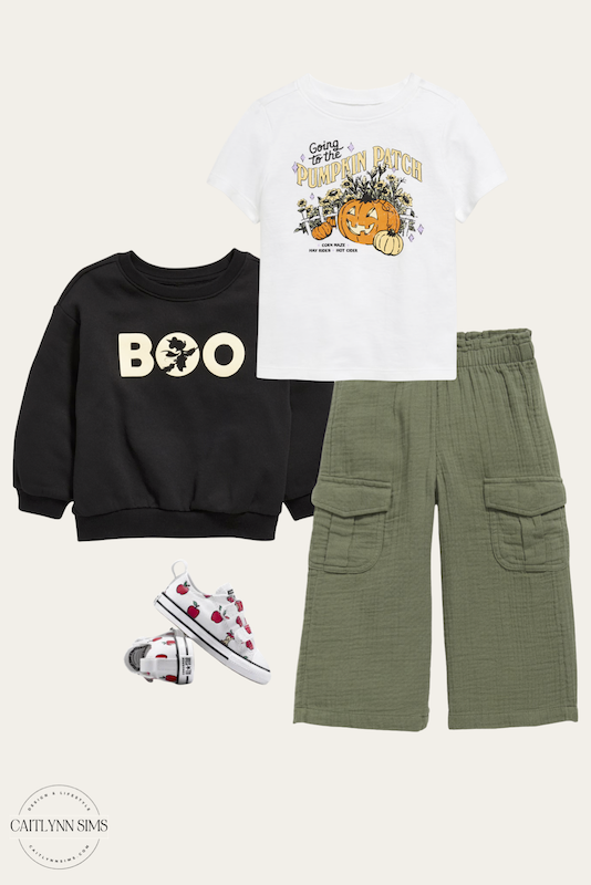 I would actually wear this outfit if it was my size. Cargo pants, a halloween-themed shirt and sweatshirt, and some cute Converse. Sign me up. But this is the toddler version, so it’s way cuter.